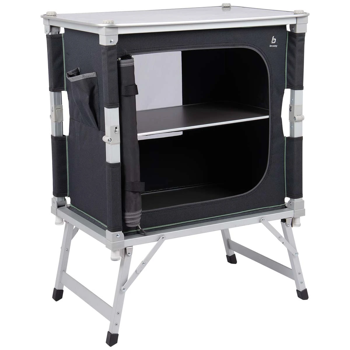 De Bo-Camp Edith is een compacte en veelzijdige kook- en opbergkast. Dankzij het handige ‘easy to fold’ systeem is de kast snel in- en uit te klappen, wat zorgt voor eenvoudig gebruik en opslag. De kast is uitgevoerd met een luxe, tweekleurige 600D polyester bekleding en beschikt over twee legplanken en een ventilatievenster voor optimale luchtcirculatie. Aan de zijkanten vind je twee extra opbergvakken, ideaal voor het bewaren van kookgerei. Het stevige bovenblad is waterbestendig en hittebestendig, waardoor het perfect is voor gebruik in de buitenkeuken. Bovendien is de kast in twee hoogtes verstelbaar en wordt hij geleverd met een praktische draagtas, zodat je hem moeiteloos overal mee naartoe neemt.