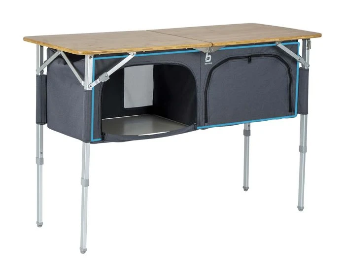 Een hoogwaardige kookkast met een robuust aluminium frame en verstelbare poten. Dit kookmeubel beschikt over een slim ontworpen bamboe oplegblad dat in delen kan worden gebruikt, waardoor het eenvoudig en compact op te vouwen is. Uitgerust met twee ruime opbergvakken, elk voorzien van een stevige legplank. Het tafelblad is bestand tegen hitte en water, en de poten zijn in hoogte verstelbaar tot 80 cm.