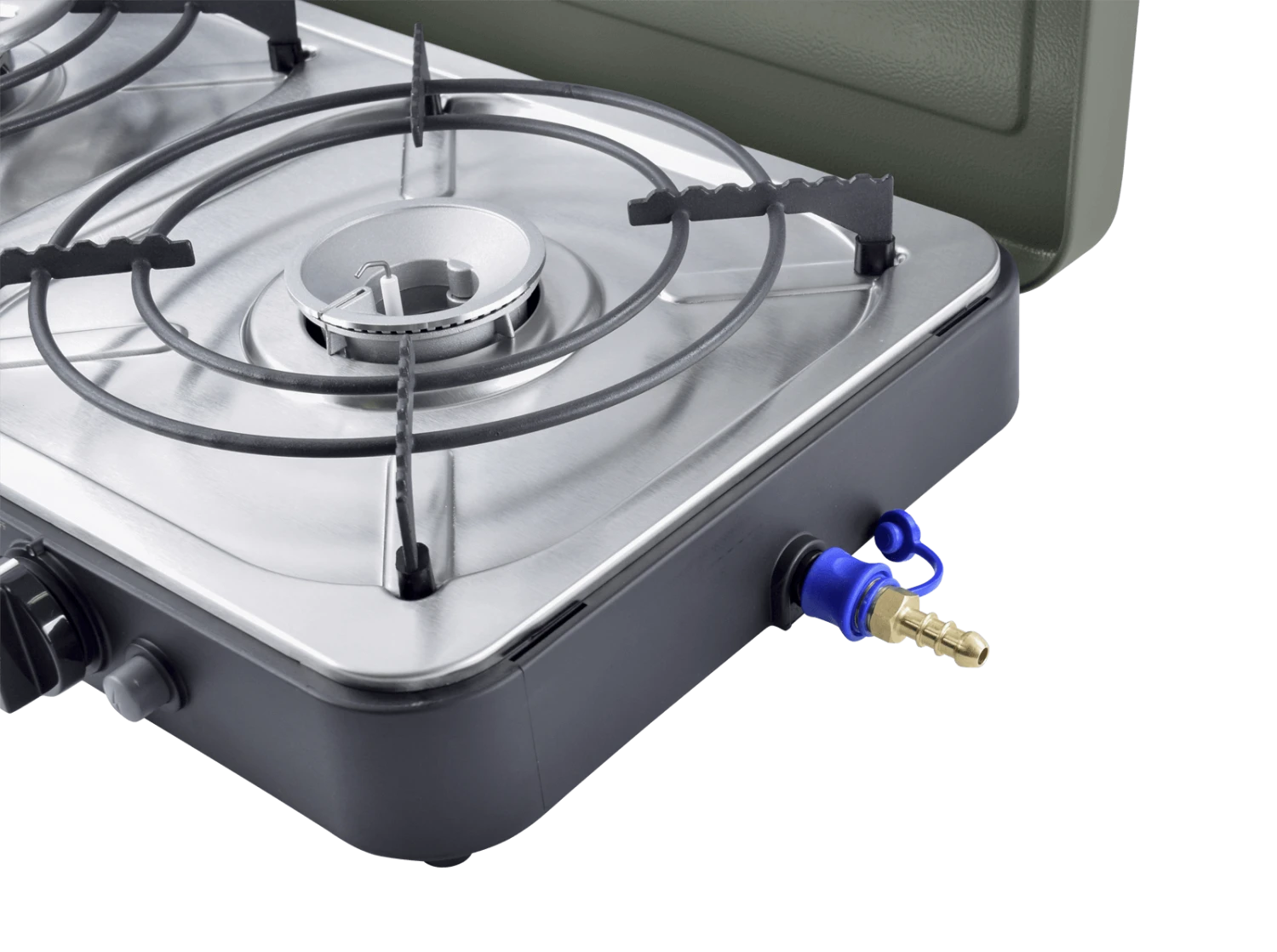 Dit lichte kooktoestel met twee branders en automatische piëzo-ontsteking is de perfecte metgezel voor op de camping. Het wordt geleverd met een Quick Release koppeling voor snel aansluiten. De branders werken afzonderlijk van elkaar en kunnen tegelijkertijd in gebruik zijn. De 2 Cook 3 Pro Deluxe set bevat twee pandragers, een bakplaat, een grillplaat, twee windschermen en een houder voor een percolator. Dit maakt het mogelijk om bijvoorbeeld pasta te koken terwijl je groenten grilt, of koffie te zetten terwijl je een ontbijtje bereidt. De bakplaat en grillplaat zijn voorzien van een GreenGrill keramische coating, en de handige handgreep maakt het eenvoudig om de platen te plaatsen of te verwijderen.