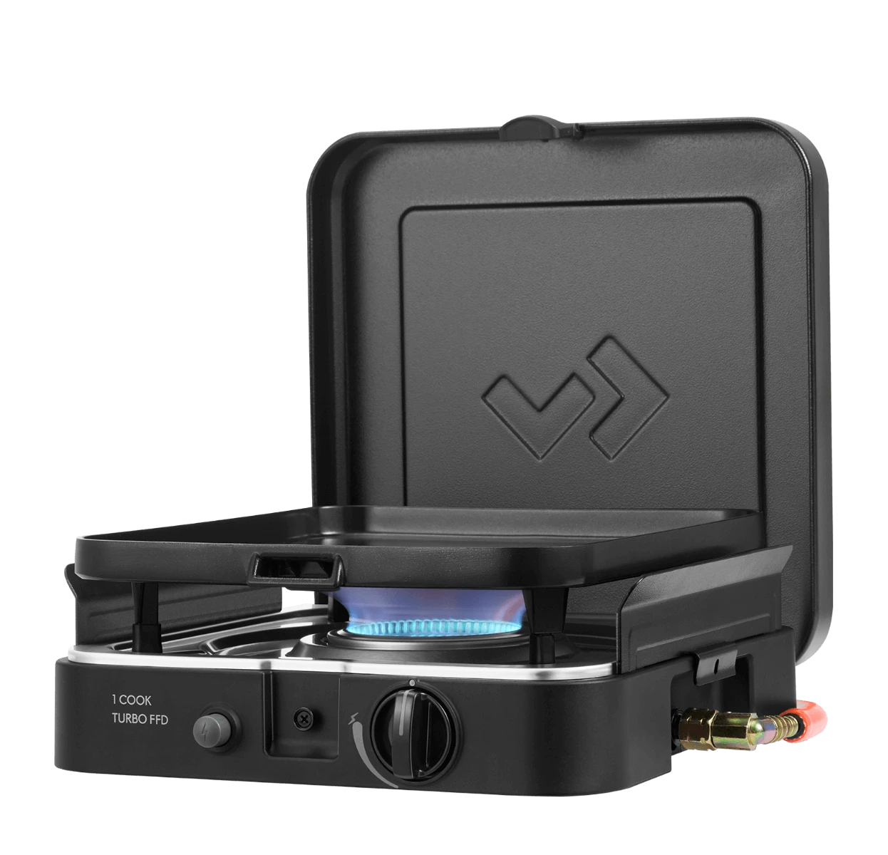 Dit compacte Cadac kooktoestel is geschikt om zowel binnen als buiten te gebruiken. Het toestel neemt weinig ruimte in en is daarom ideaal voor kampeerders. Deze Cook 1 Turbo FFD is voorzien van een thermische beveiliging (FFD). Als de vlam onverwacht uitgaat, stopt de gastoevoer automatisch. Het kooktoestel beschikt over een uniek Turbobrander die zorgt voor een gerichte en krachtige warmteafgifte. De brander ligt laag in het toestel. Hierdoor is hij minder gevoelig voor wind. Bovendien wordt hij geleverd inclusief twee windschermen voor extra bescherming tegen de wind. Deze bevestig je eenvoudig aan de zijkanten van het toestel.