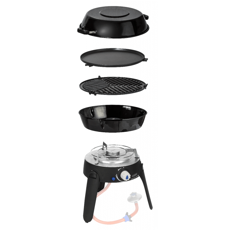 De barbecue wordt geleverd met een handige draagtas en is uitgerust met een roestvrijstalen brander voor langdurig gebruik. De uitneembare vetpan vangt kookresten op en fungeert tevens als windscherm. Het gebruik van een slang en drukregelaar maakt het eenvoudig om gas aan te sluiten voor extra gemak.