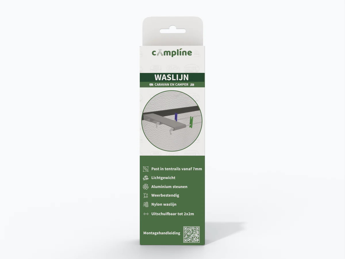 Handige waslijn die past in de tentrail van je caravan of camper. Sterke lichtgewicht aluminium steunen met een nylon waslijn. Uitschuifbaar tot twee keer twee meter.