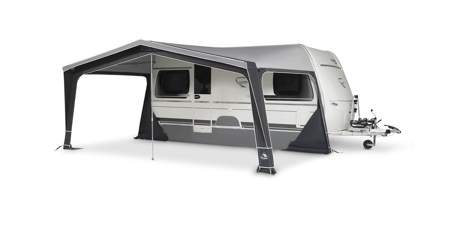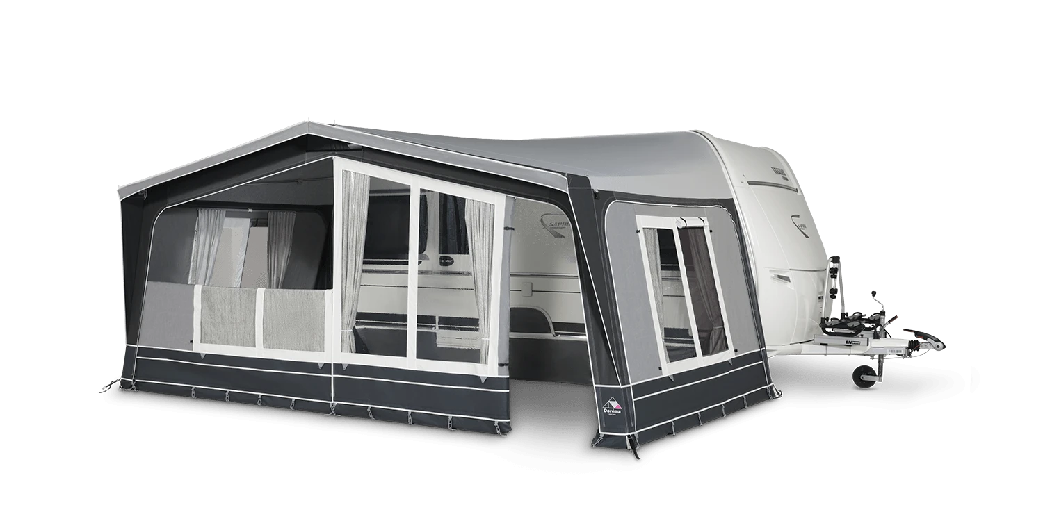 Ontdek de Doréma Diamond 300 voortent, ideaal voor zowel uitgebreide reizen als seizoensgebonden kamperen. Deze voortent heeft een diepte van 3 meter, wat zorgt voor een ruime en comfortabele leefruimte. Op zonnige dagen kunt u de voortent eenvoudig omtoveren tot een diepe luifel door de voor- en zijwanden te verwijderen. Standaard zijn stijlvolle gordijnen en losse slikranden die met klittenband bevestigd worden inbegrepen, evenals deuren in de voor- en zijwanden voor gemakkelijke toegang.