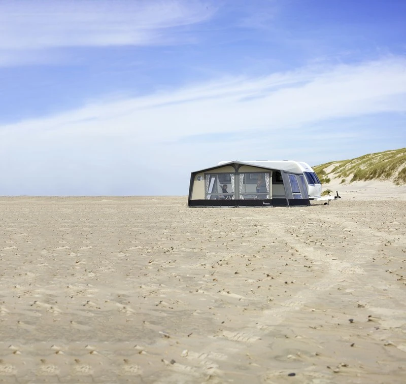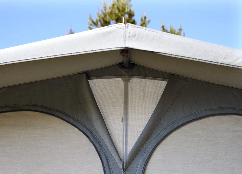 De grote ramen in de front- en zijpanelen zijn rond afgewerkt in de bovenste hoeken en zorgen samen met de hoge ramen achter in de zijwand voor voldoende licht in de gehele voortent. Het ademend Isacryl materiaal is bijzonder kleurvast en zorgt samen met de ingebouwde nokventilatie voor een prettig binnenklimaat. Op warme dagen bieden de insectenhorren in de beide zijwanden voldoende ventilatie.