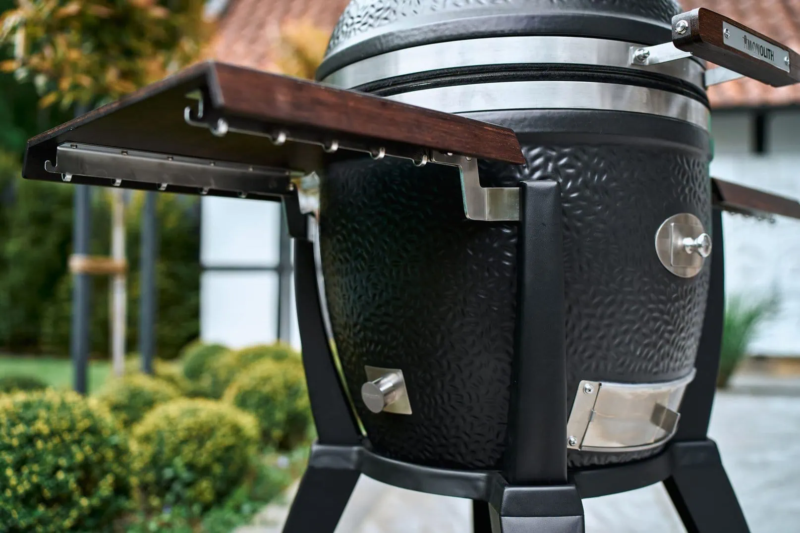 – Zijtafels van gecarboniseerd bamboe: Hoogwaardig en visueel aantrekkelijk, perfect voor het plaatsen van barbecuebenodigdheden.