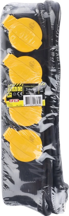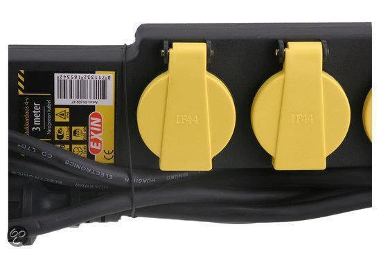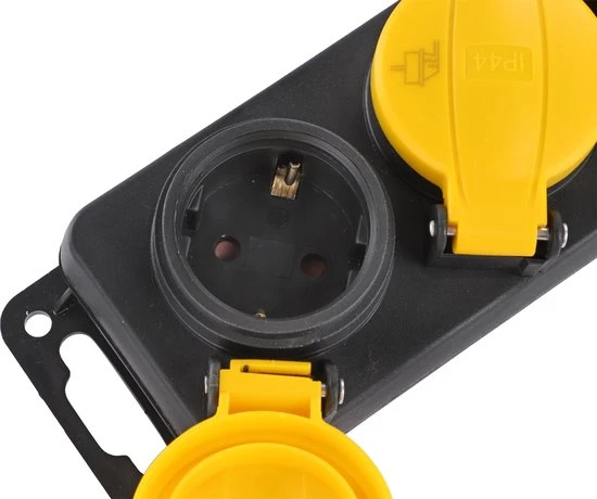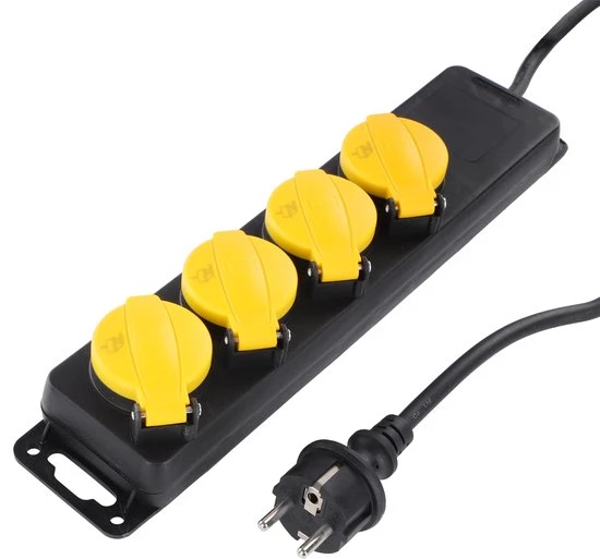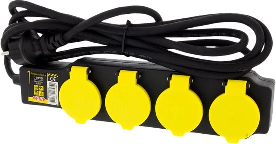 Spatwaterdichte contactdoos met 4 randaarde stopcontacten. De contactdoos is voorzien van een 3 meter lange kabel.