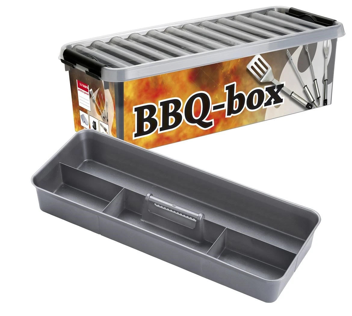 Barbecueën wordt pas echt een feestje met de Q-line BBQ-box van Sunware, met een inhoud van 9,5 liter. Nooit meer zoeken naar je barbecue-tang, sateprikkers of dat ene schortje – deze box zorgt voor orde in de barbecuechaos. Alles wat je nodig hebt voor een geslaagde BBQ-avond past erin: tangen, vorken, spiesen, handschoenen, aanmaakblokjes, lucifers en meer.