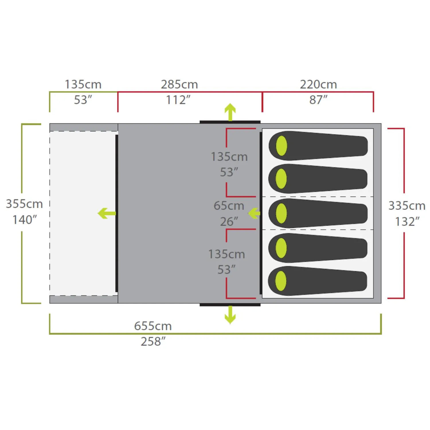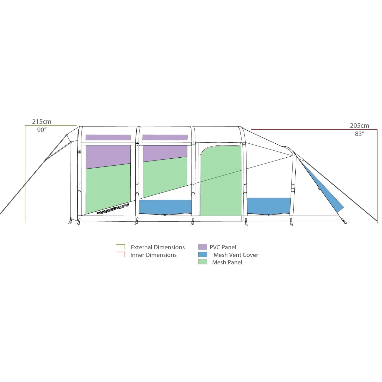 De leefruimte is 280 cm diep en heeft twee zij-ingangen met horramen, ideaal voor frisse lucht zonder insecten. De luifel van 135 cm diep biedt een fijne schaduwplek. Accessoires zoals een reparatiepatch, manometer, drukontlastingsventiel en kabelbinders zijn inbegrepen voor jouw gemak.