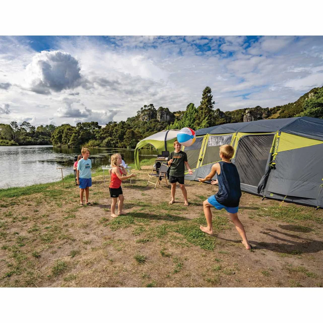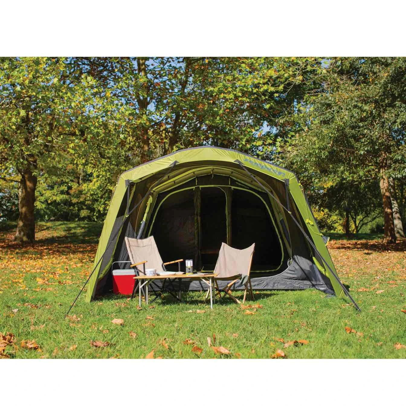 De tent is uitgerust met verduisterend materiaal in de slaapruimtes voor een ongestoorde nachtrust. De hoekige constructie van het frame biedt niet alleen meer ruimte binnenin, maar zorgt ook voor extra stabiliteit en windbestendigheid. Voorzieningen voor lantaarns en elektriciteitsdoorgang zijn strategisch geplaatst voor jouw gemak. Een ventilatievenster aan de achterkant zorgt voor verkoeling zonder in te leveren op privacy.
